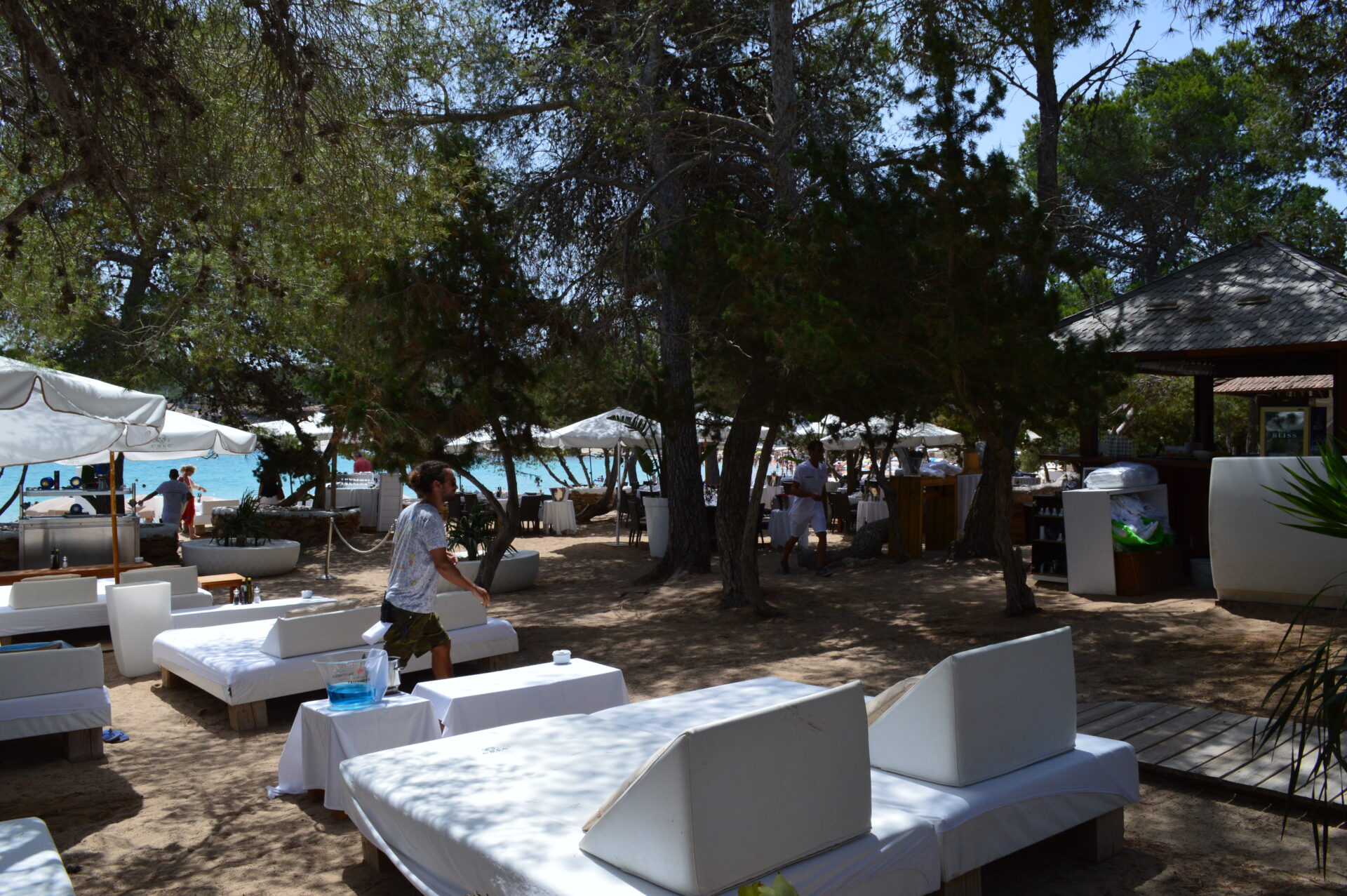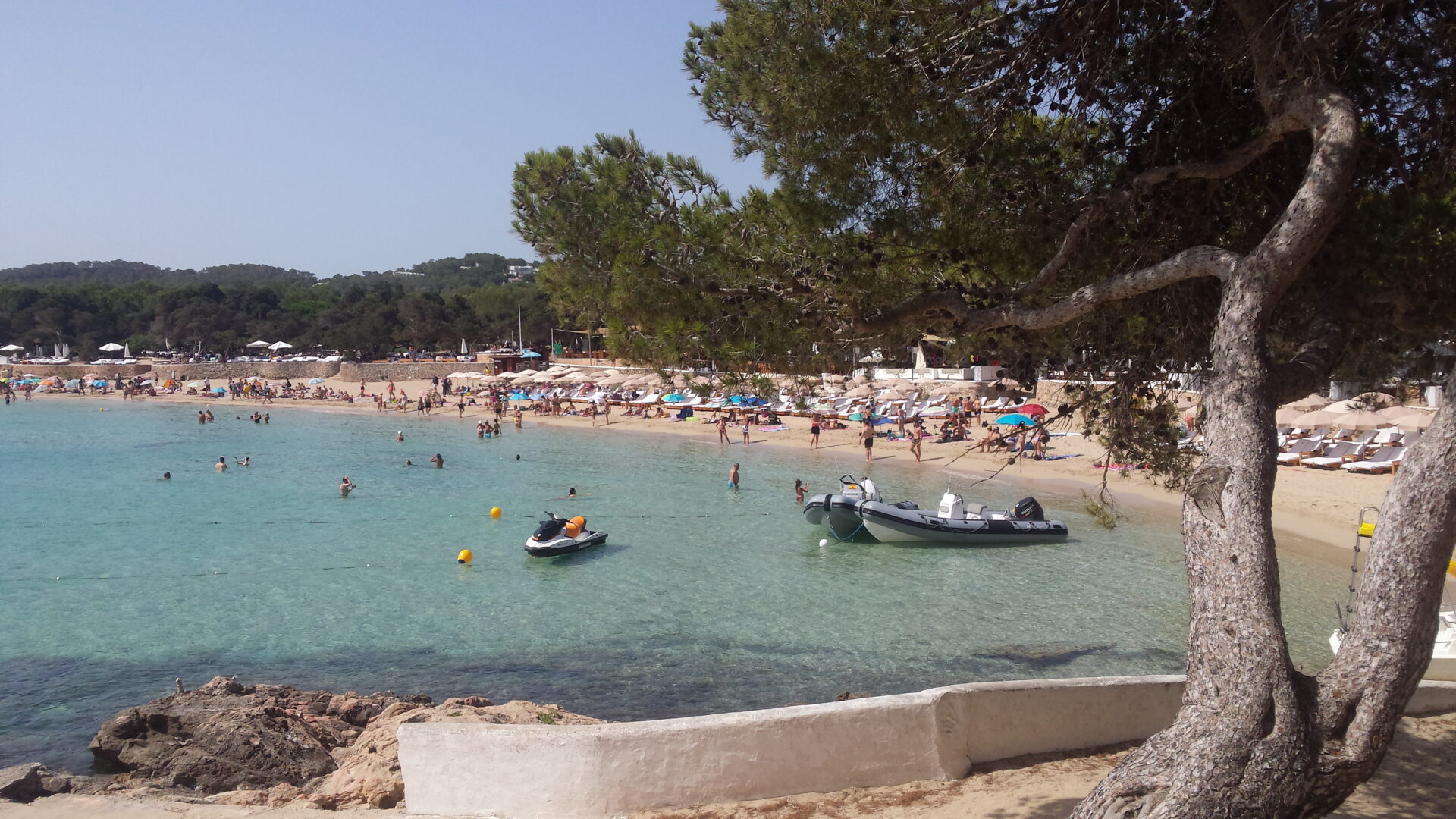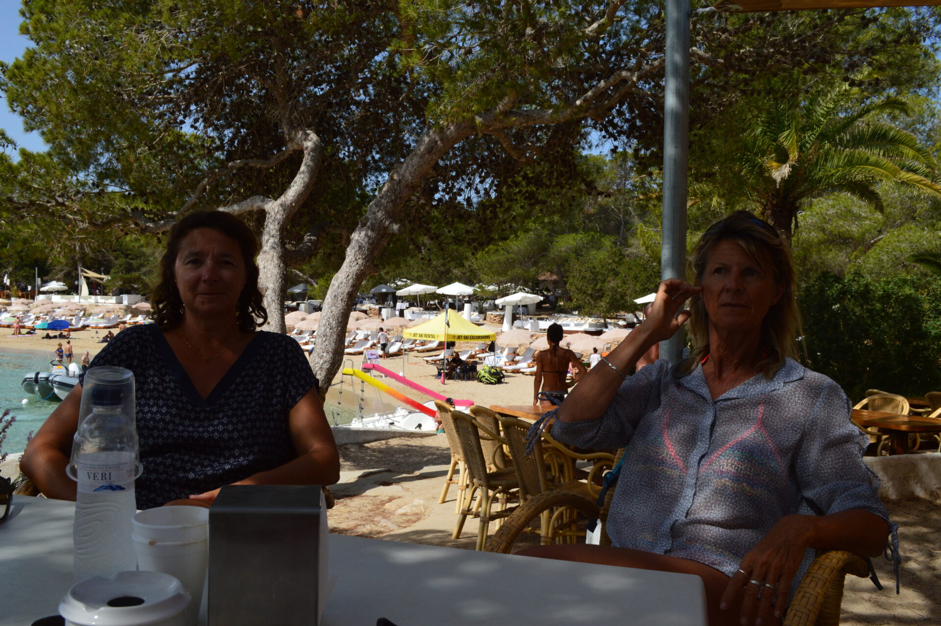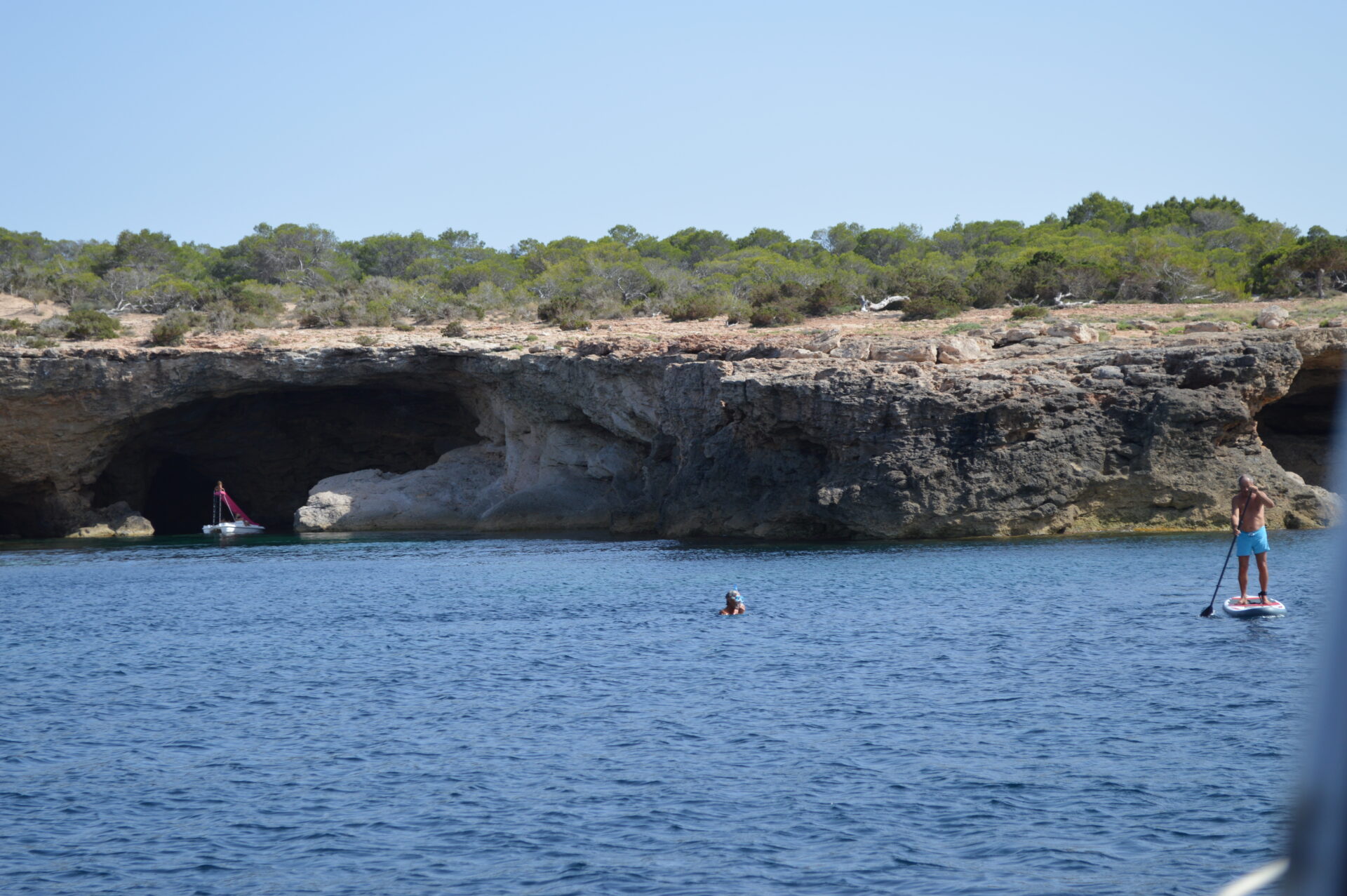 jeudi 23 juin 2017. On fait les courses au petit super mercado je ramène le scout et vers midi on part vers la Cala Saona car entre les navettes, les ferrys et les yachts qui passent plein pot on se fait rouler de temps à autre. Encore un beau mouillage, eau toujours transparente bien aéré. Pas mal de monde .Petit bar à terre grand hotel 4 étoiles et quelques restaurants. Belle plage le pied. Et puis le petit bar certe un peu cher mais tellement agréable.