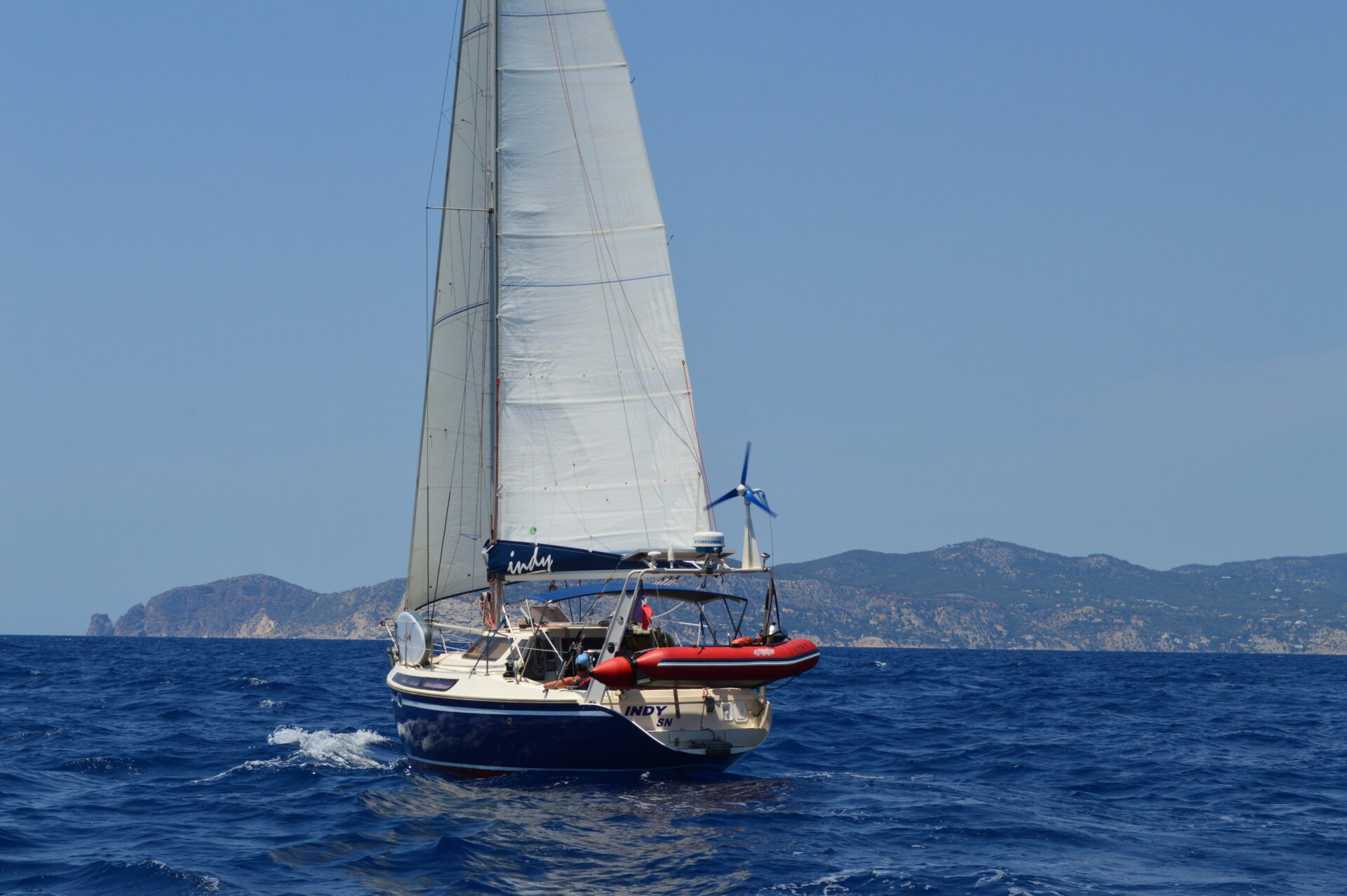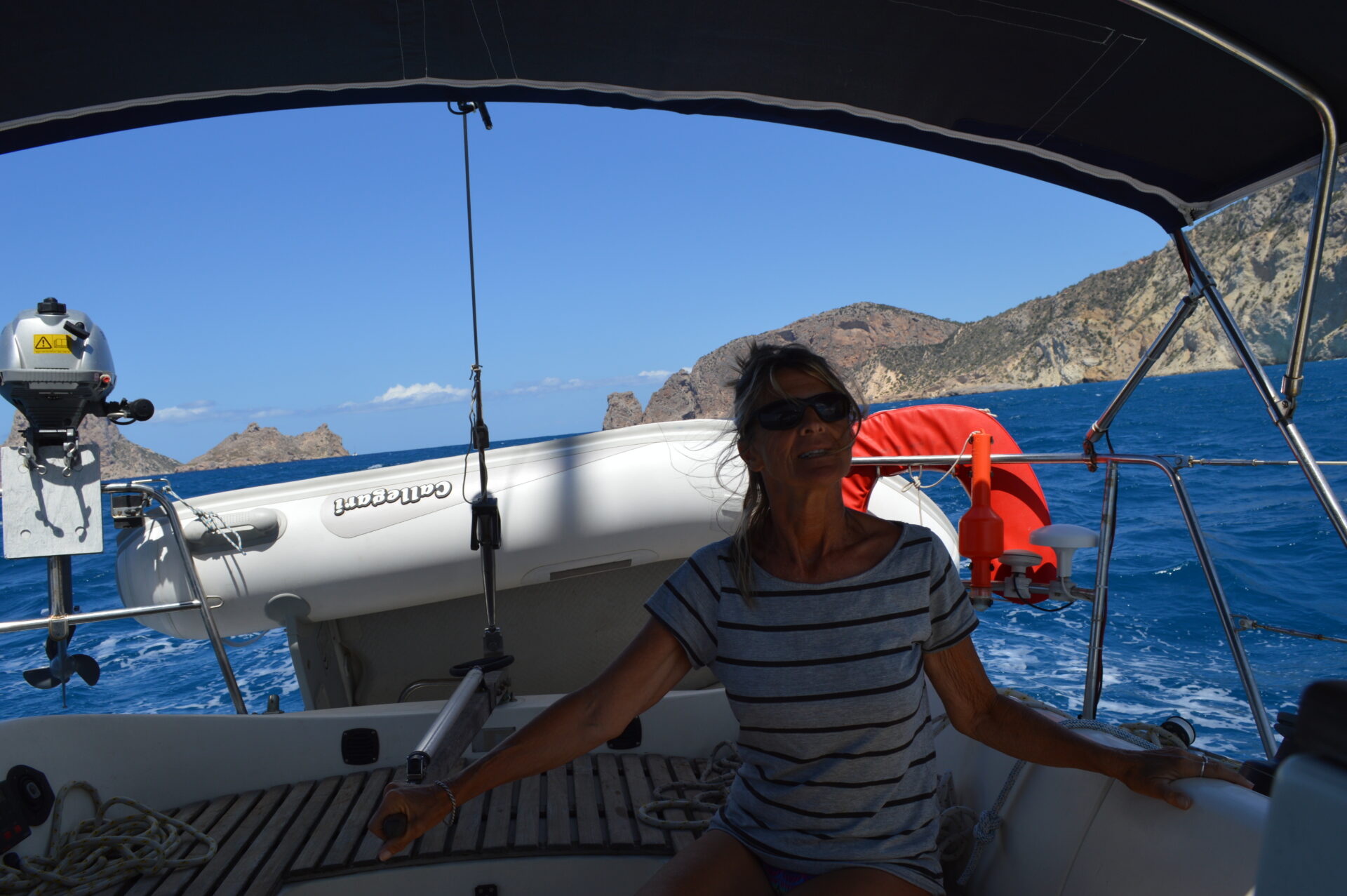 Jeudi 1 juin. Nous hissons les voile en direction du cap Creus (le cap Horn de la méditerranée). Il y a quelques bateaux devant nous. Bien sur je règle finement pour les déposer. Hélas éole faiblit et c’est par une risée Yanmar et une farouche détermination que nous terrassons ce redoutable cap. Pascale immortalise cet exploit par des photos haute définition. Dans l’après midi nous mouillons dans la jolie cala Montgo. Nous allons y rester une semaine car nous attendons Benjamin qui va venir passer deux jours.