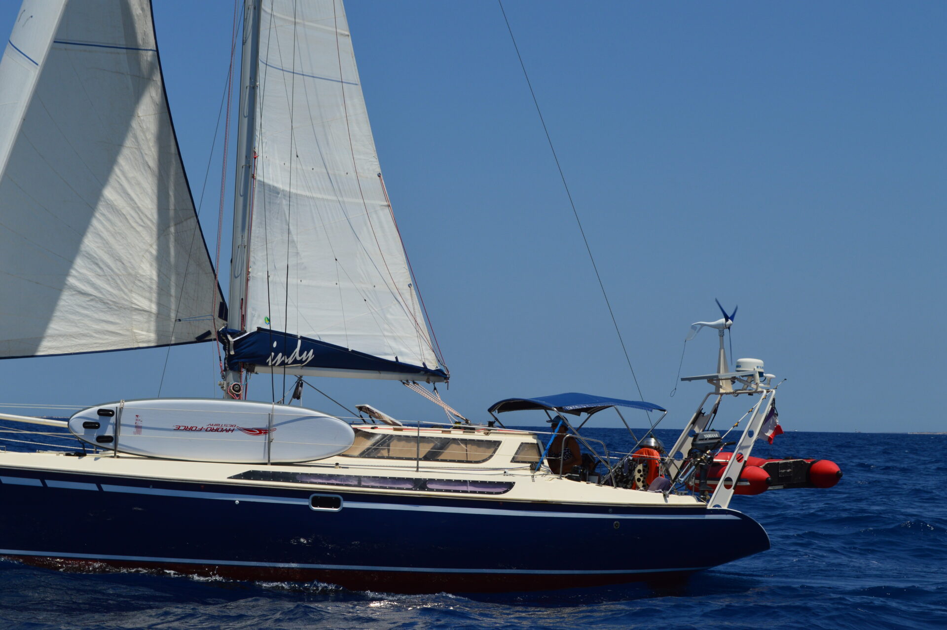 Jeudi 30 juin Le matin ça bouge. On retraverse et on mouille à Cala Morro. L’après midi on se fait le beau mouillage de la cala des comte. Là aussi ça roule. Vers 17 heures toujours suivi Indy nous mouillons derrière l’ile Conarera. Repas à bord avec Indy. Vers 4h30 le vent de nord se lève rendant le mouillage inconfortable. Cela dure une heure puis ça ce calme.