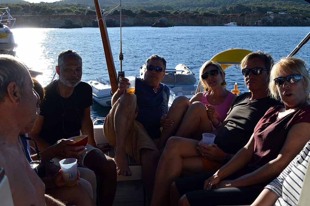 Samedi 1 juin : Départ à 8 heures pour Ibiza. Belle mer nous ferons du moteur pendant les deux tiers du parcours. On voit des globicéphales, des thons et même des dauphins. On mouille à la Cala Lleo. On fait un apéro dinatoire sur Arawak. Tout le monde est déchainé. Luc manque de s’étouffer tellement il rit.