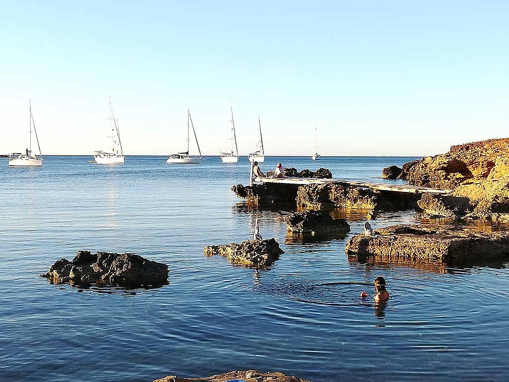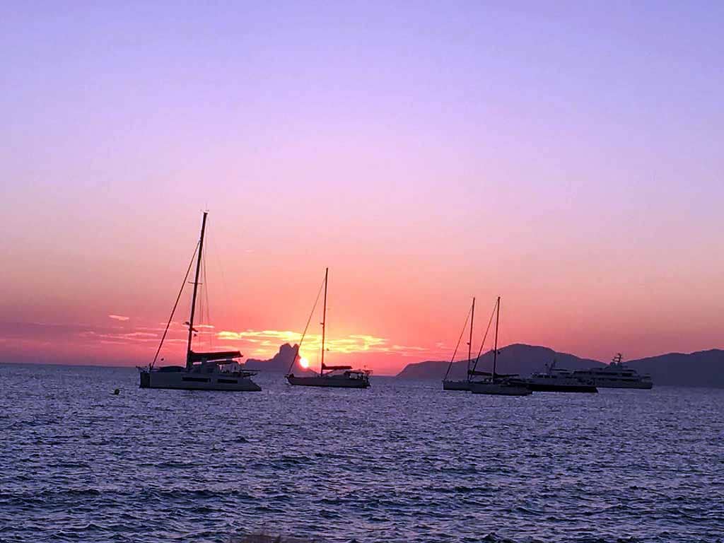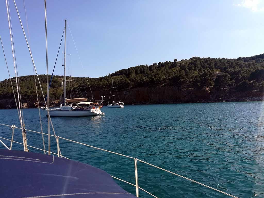 Jeudi 6 juin : Dès le petit déjeuné avalé nous mettons les voiles ; enfin le génois et trouvons la jolie petite cala bien abrité de Benirras juste avant San Miguel de Balansat. Petite promenade à terre et apéro tous ensembles sauf Kairos. Nous finissons la soirée sur Wanpu.