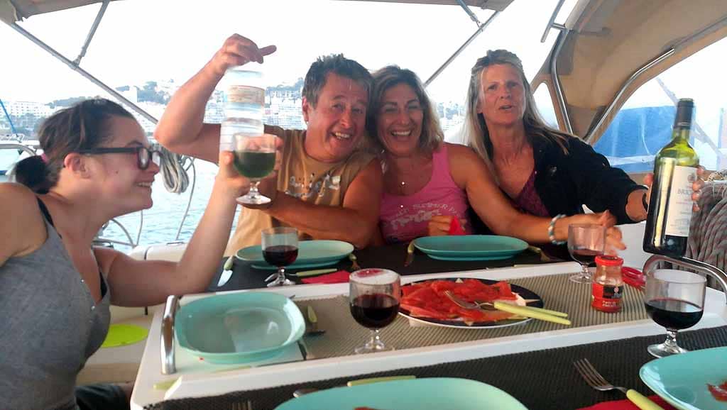 Vendredi 31 mai : Le temps commence à se réchauffer légèrement 19° dans l’air et que 19,8 dans l’eau. Mais ne nous plaignons pas l’endroit est magnifique. Nous allons mouiller à la Cala Escandemar qui se trouve juste à coté. L’eau est cristalline. Une équipe Espagnole est entrain de tourner un film pour une série de Netflix. Le soir nous allons tous ensemble boire une sangria dégeulasse sur la terrasse d’un bar. Bonne ambiance. Mais Sangria pas top.